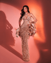 A form-fitting nude gown adorned with cascading pearl embellishments and lavish floral appliqués. The plunging neckline is framed by ornate pearl straps, while layered pearl strands create fluid draping across the skirt. Subtle feather accents and radiant highlights complete this opulent, high-fashion design. Perfect for red-carpet events, editorials, and luxury soirées.