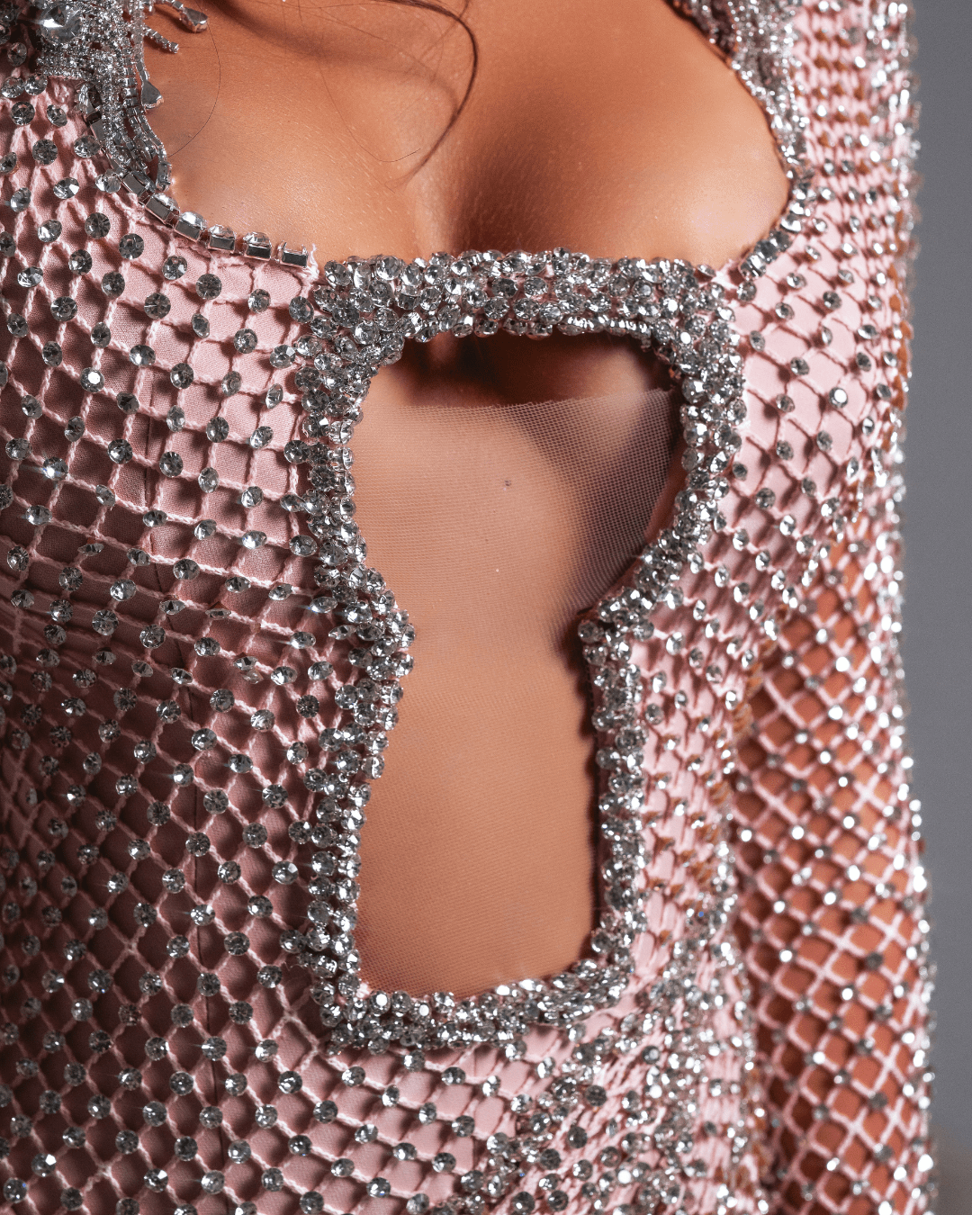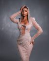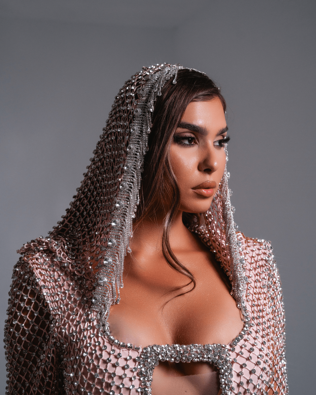 A striking couture gown crafted from crystal-embellished mesh, featuring a dramatic front keyhole cutout, long sleeves, and an integrated draped hood. Designed to shimmer and command the spotlight.