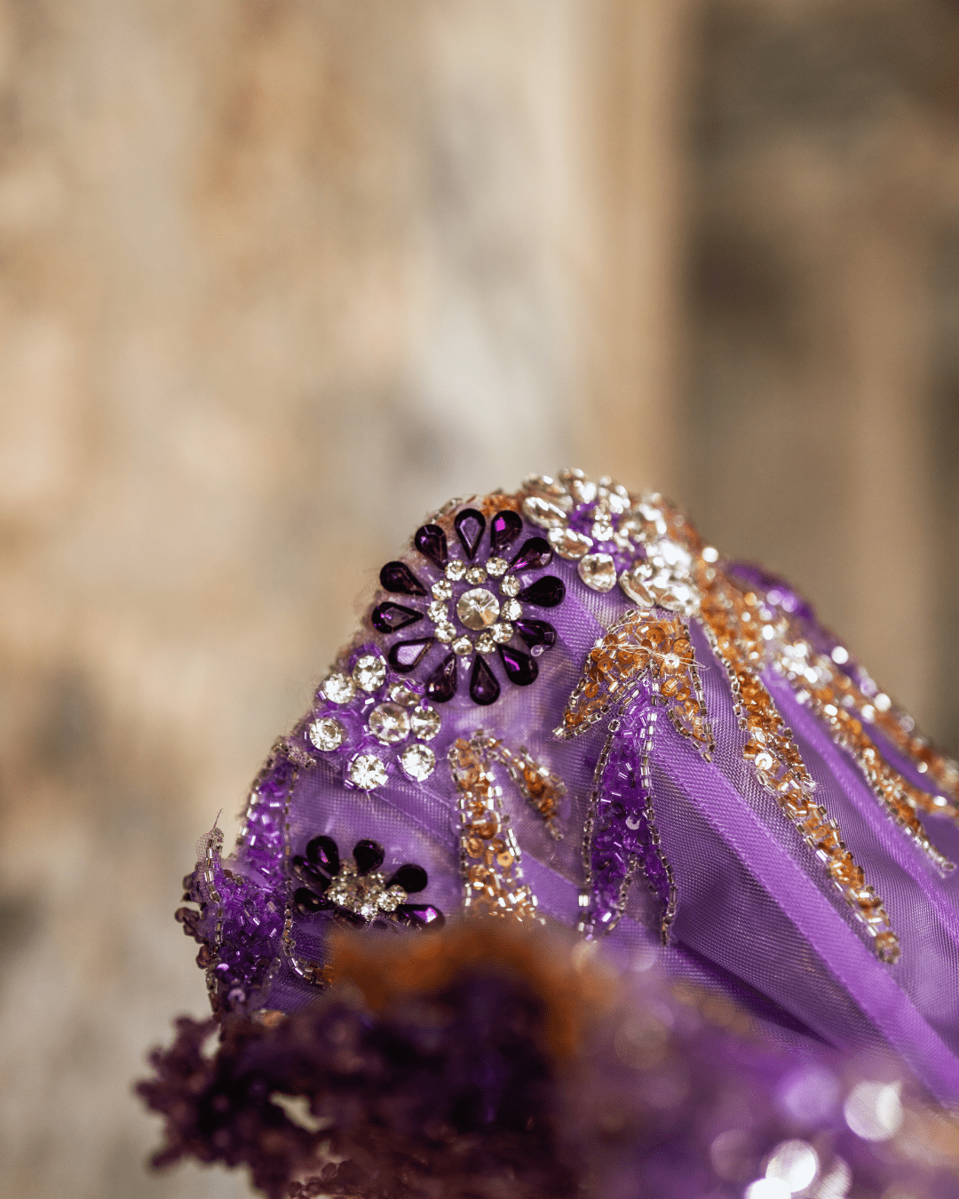 A regal lavender couture gown featuring a sculptural structured shoulder bodice, hand-applied crystal embellishments, sheer skirt panels, and a dramatic tulle cascade train.