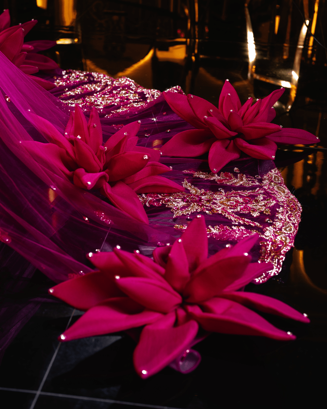A bold magenta gown with a form-fitting silhouette, hand-embroidered crystals, and sequins tracing the body. Featuring sheer fuchsia tulle cascades that bloom into a dramatic train with oversized silk floral appliqués. The illusion neckline and structured details balance romance with authority, creating a regal, unforgettable presence—perfect for red-carpet events, galas, and high-fashion soirées.