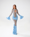 A floor-length gown with a sheer illusion base, lavishly embellished in silver crystals. Featuring a high neckline with keyhole cut-out, long fitted sleeves with ruffled cuffs, and sculptural ruched detailing at the waist. Finished with cascading powder blue textured fabric for dramatic movement and couture presence. Perfect for galas, red-carpet events, and luxury soirées.