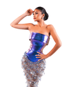 A strapless couture gown with a sculpted metallic‑violet corset bodice and a floor‑length mermaid skirt encrusted with iridescent sequins and crystal appliqués in a scale‑like pattern. The laminated satin sheen of the top contrasts with the shimmering, textured lower half for a futuristic yet elegant red‑carpet statement.