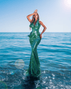 A striking green couture gown fully adorned with high-shine sequins and crystal details, featuring a deep V neckline and a sculpted mermaid silhouette inspired by ocean shimmer.