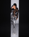A couture gown featuring a sheer embroidered lace bodice with illusion cut-out and a crystal chain-embellished skirt finished with delicate feather accents. Designed for powerful red-carpet moments.
