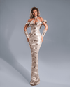 A statement of pure glamour, this figure-hugging gown shimmers with radiant metallic texture and architectural strap detailing. Designed to contour the body, it delivers a bold, high-impact silhouette with an unmistakably luxe finish.