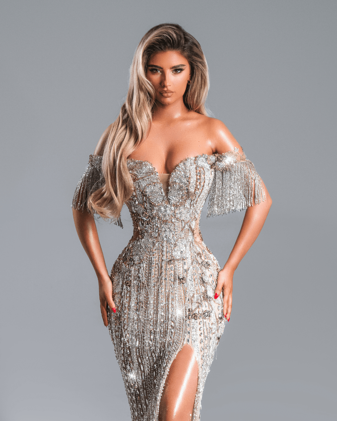 Radiating pure glamour, this crystal-embellished gown features an off-shoulder corset bodice with cascading fringe and a sculpted silhouette that catches the light from every angle. Finished with a daring thigh-high slit, it’s designed to shimmer with every step.