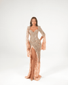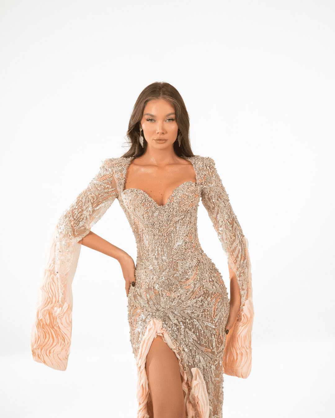 A luxurious floor-length evening gown that exudes modern elegance and refined glamour. Designed with a sweetheart neckline and a structured bodice that beautifully enhances the feminine silhouette, this gown is richly adorned with hand-embroidered crystals and intricate detailing. The sheer long sleeves and soft textured accents along the skirt create dramatic movement and a romantic couture feel. A high side slit adds a touch of sensual sophistication, making this gown a perfect choice for red carpet appearances, gala evenings, and formal events.