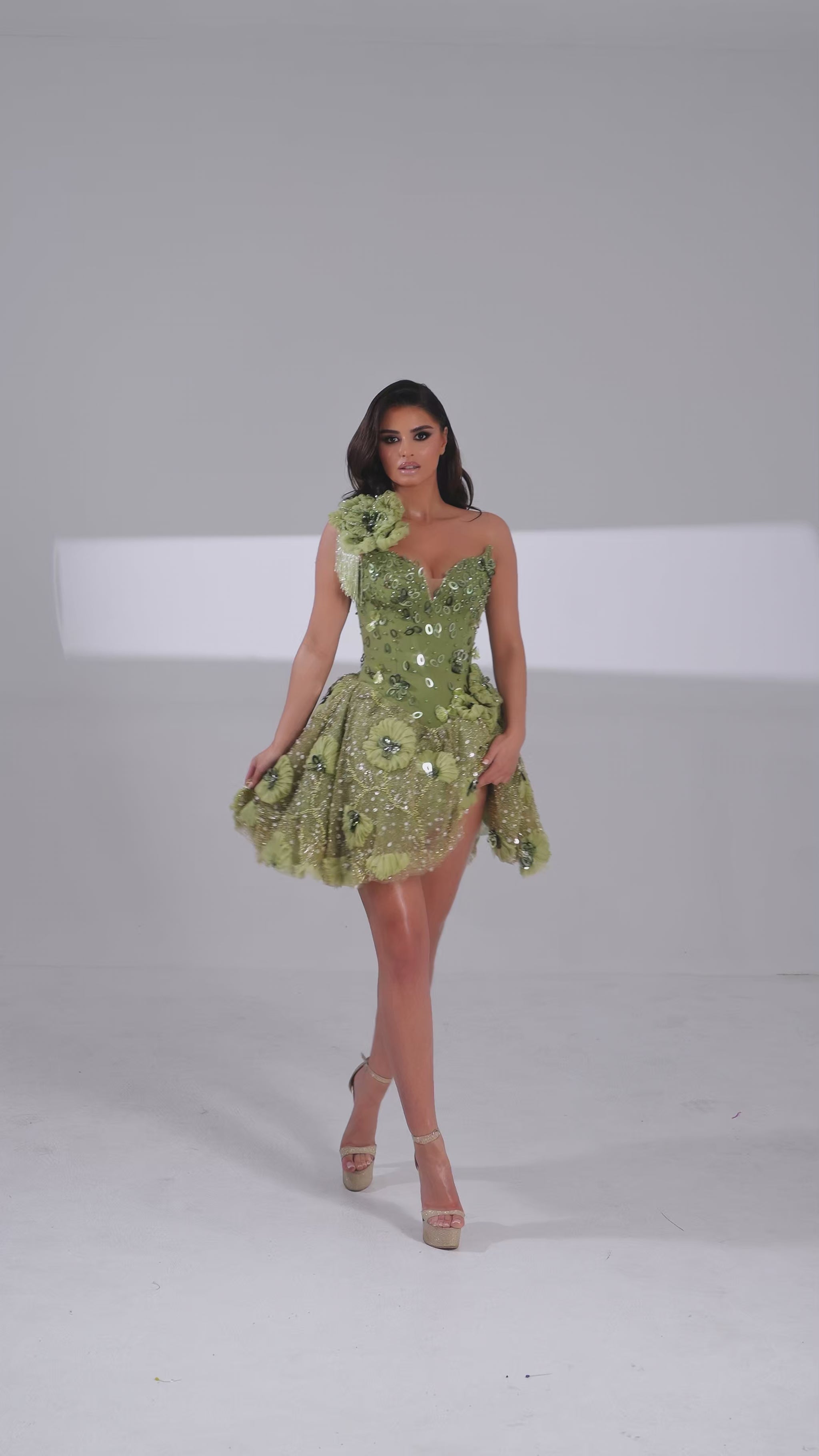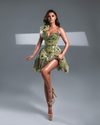 Designed to captivate, this statement mini features a sculpted corset bodice adorned with intricate crystal and floral appliqués, flowing into a sheer, petal-textured skirt that shimmers with movement. A romantic green hue and couture detailing create a bold, high-glamour silhouette with modern edge.