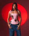 A sculpted ribbed corset in soft blush pink with delicate shoulder tie straps. Adorned with shimmering crystals, metallic petals, and iridescent 3D floral embellishments, it blends romantic elegance with modern edge. Versatile for both casual styling with denim or elevated evening looks, this piece is bold yet delicate—perfect for photoshoots, events, and standout street style.