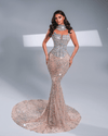 A show-stopping mermaid silhouette adorned with luminous crystal embellishments, designed to sculpt the body and shimmer with every movement. This gown captures pure opulence with a modern couture edge.