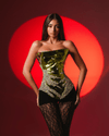 A sculpted metallic gold corset with a liquid-metal finish, transitioning into a crystal-embellished lower section for bold sparkle. Paired with black lace tights featuring intricate floral motifs, the look balances futuristic shine with delicate transparency. Radiant and editorial, perfect for standout evening wear and high-fashion shoots.