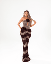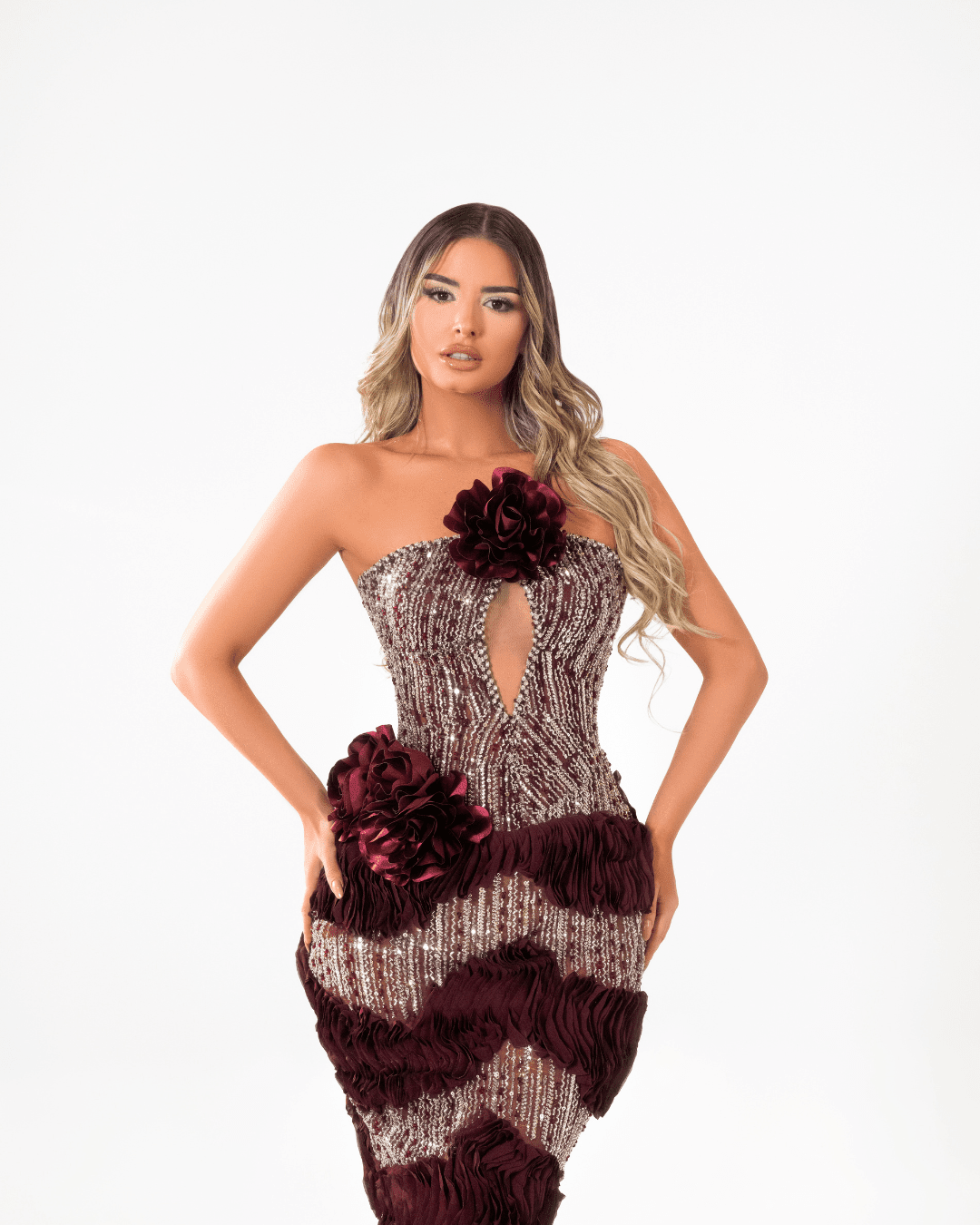 A captivating floor-length gown that radiates couture elegance and modern allure. Crafted with a strapless straight neckline, this design features a sculpted bodice accented by a delicate central keyhole cut-out for a subtle touch of sensuality. Hand-embroidered sequins shimmer throughout the gown, while dramatic 3D floral appliqués and textured fringe detailing create depth, movement, and visual impact. The sleek column silhouette elongates the figure, making this gown a striking choice for red carpet appearances, formal galas, and high-profile evening events.