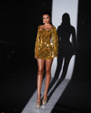 A statement mini dress fully adorned with reflective gold mirror crystals, designed to sculpt the body and shine from every angle. Bold, glamorous, and made for the spotlight.