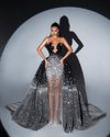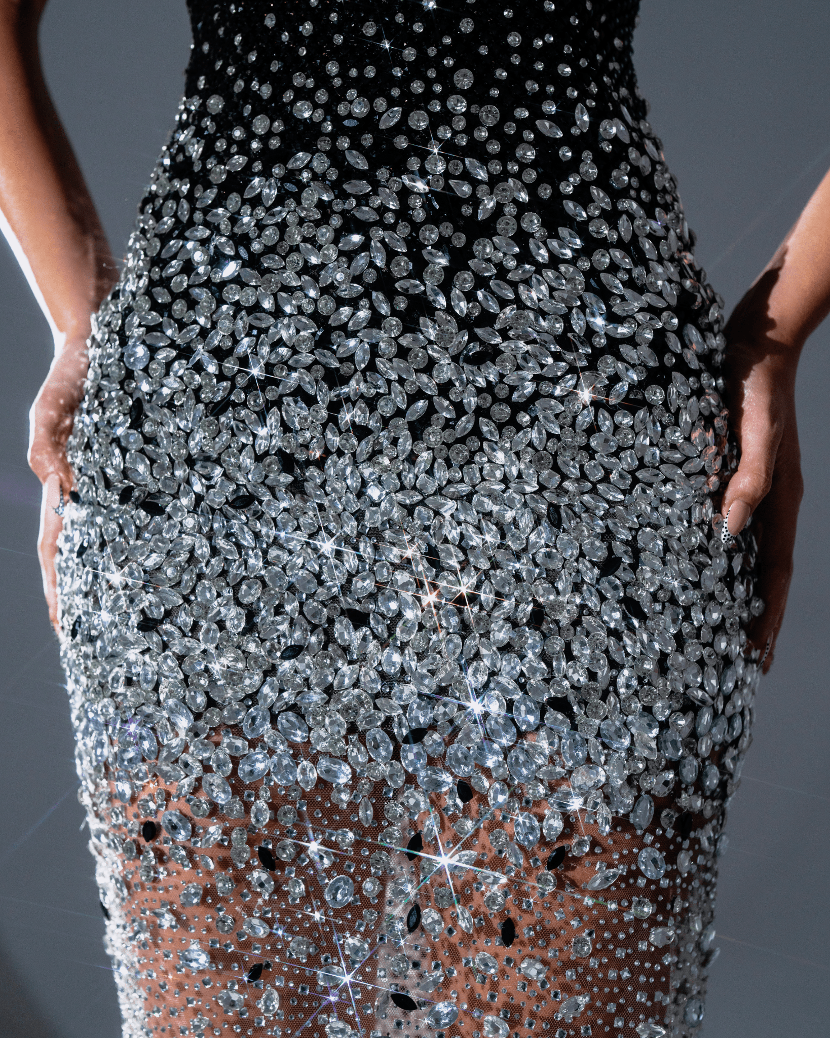 A statement gown featuring a sculpted crystal-embellished bodice and a dramatic black-to-silver ombré overskirt. Designed for red-carpet entrances and unforgettable nights.