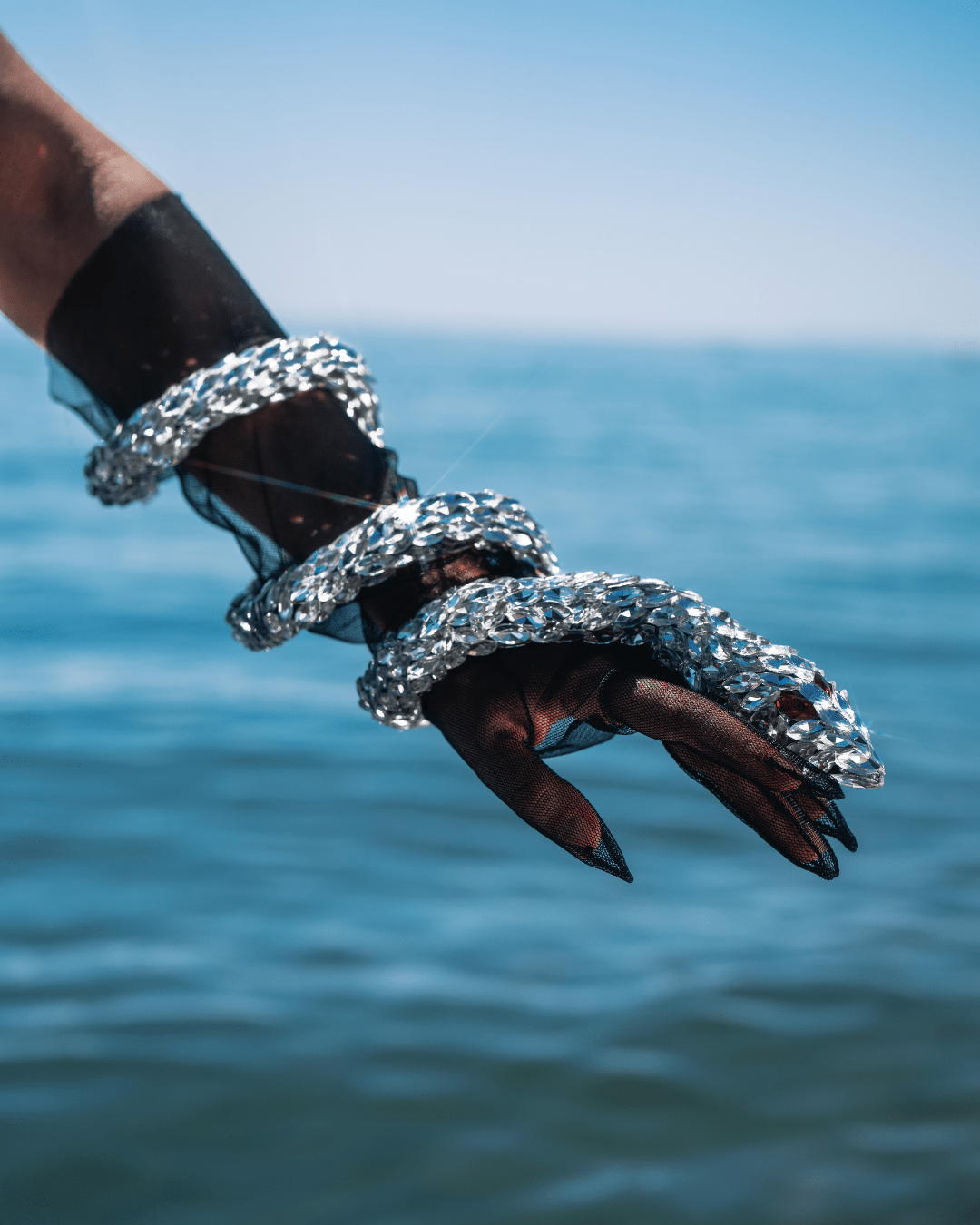 Mermaid gown in silver-blue tones, featuring a sculpted corset bodice and liquid-sequin finish for a bold, celestial look.