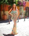What truly sets this dress apart is its intricate embellishments. Adorning the lace are beautiful 3D flowers, meticulously crafted to create a lifelike and enchanting effect. These flowers cascade gracefully across the dress, adding depth and texture to the already exquisite fabric. Each flower is a soft, enchanting aqua color, bringing a refreshing and serene touch to the overall design.