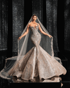 A floor-sweeping veil, delicately embroidered with matching silver accents, completes the look, evoking the essence of royalty and timeless beauty. The gown’s blend of soft champagne hues and luminous silver detailing makes it ideal for an extravagant wedding, red carpet moment, or haute couture affair.