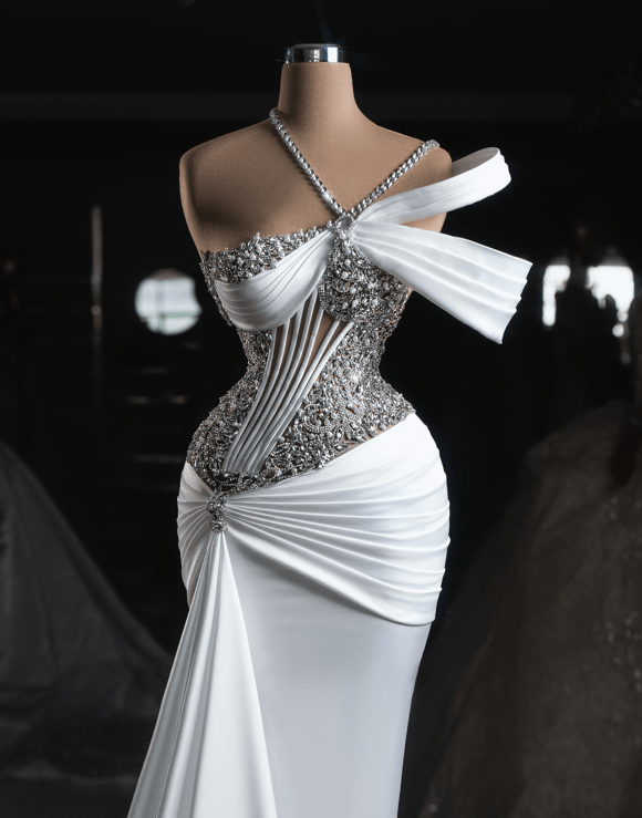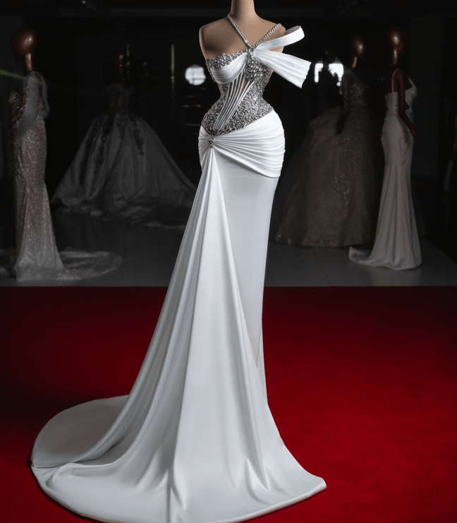 One of the gown’s most striking features is its asymmetrical neckline, a contemporary design that adds depth and intrigue. This artistic cut flatters the collarbone and shoulders while offering a bold yet refined aesthetic. The structured bodice is meticulously designed to accentuate the waist, flowing seamlessly into a sleek, floor-length skirt with a graceful train.