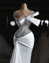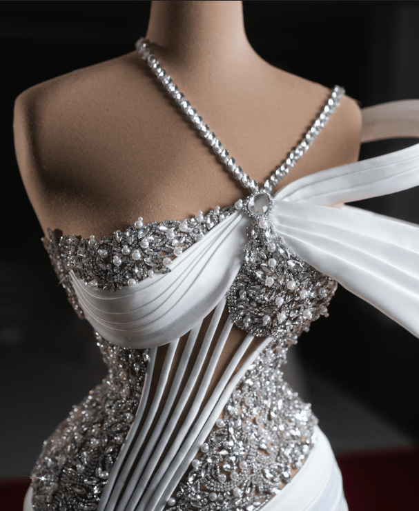 Adding a touch of opulence, the gown is embellished with hand-applied silver stones, carefully arranged to create a shimmering, celestial effect. These radiant embellishments catch the light beautifully, ensuring the bride sparkles from every angle.