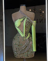 The dress has a deep cut in the chest area, which adds a touch of sensuality and elegance to the dress. The cut is designed to highlight your curves and gives the dress a flattering and feminine look. The short lengthalso allows you to show off your legs, making it perfect for a summer night or a special occasion. The dress is made of high-quality fabric, ensuring that you will look and feel your best all night long. With its unique one-shoulder design, sparkling stones, green mirrors, and chains, this dress is sure to turn heads and make a lasting impression.