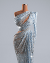 This mesmerizing gown is the epitome of refined elegance and couture sophistication, designed to highlight both femininity and strength. Crafted from a sheer, ice-blue lace fabric, it is meticulously adorned with intricate embroidery, shimmering sequins, and hand-applied crystals that catch the light with every movement. The silhouette embraces the body with a flawless drape, enhancing the curves while exuding timeless glamour.