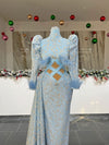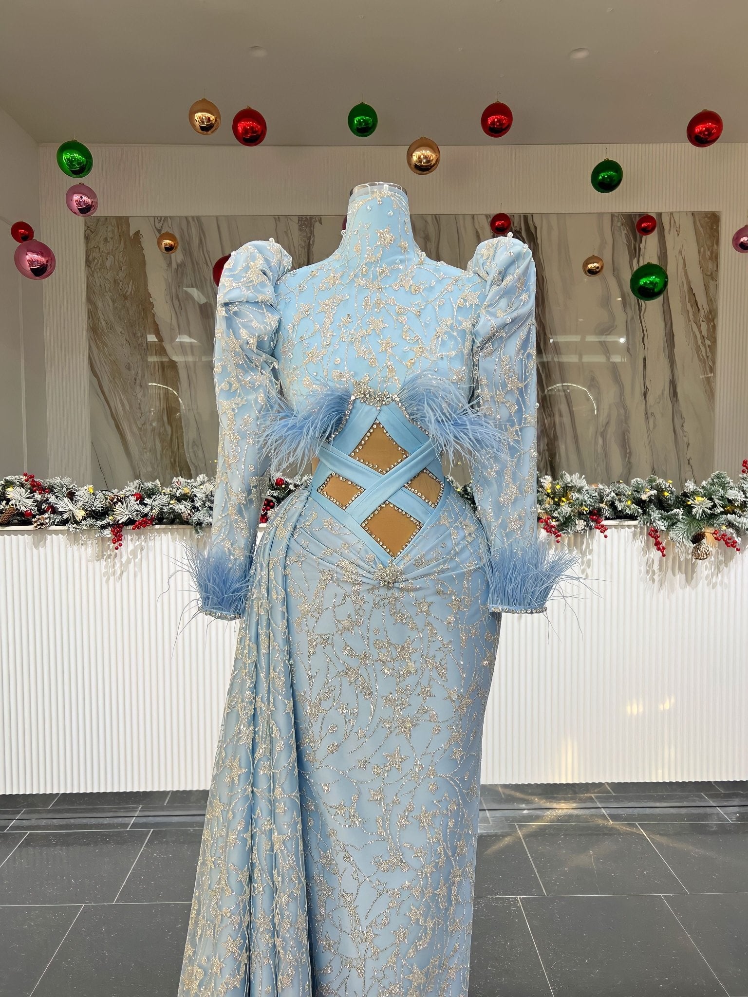 This breathtaking long light blue dress is a true work of art. The high neck and long puff sleeves give the dress a refined and sophisticated feel, while the light blue color adds a touch of whimsy and romance. The side tail detail is a unique and eye-catching feature, flowing gracefully behind you as you move. The dress is adorned with sparkling stones and crystals that catch the light beautifully, adding an extra touch of glamour and shine. The finishing touch is the feather details, which add a touch of whimsy and playfulness to the dress. The long length of the dress is perfect for a special event, and the comfortable fit ensures that you will be able to dance the night away in style. This dress is a true statement piece that is sure to make you feel like a princess.