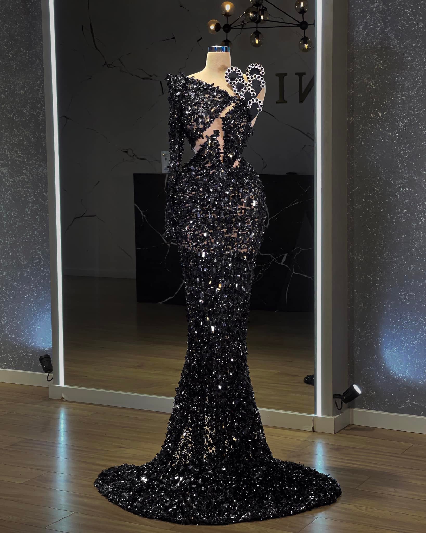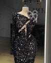 This long dress is a perfect combination of elegance and glamour. The one-shoulder design adds a touch of sophistication, while the asymmetric neckline adds a unique and fashion-forward element to the design. The dress is made of all-over black sequins lace that sparkles beautifully and catches the light in all the right places. The dress is designed to flatter your figure and accentuates your curves, making it perfect for any formal occasion. The dress is fully lined, ensuring that it is comfortable to wear and fits well. The dress is designed to make you feel confident and beautiful. It's perfect for any special event where you want to make a lasting impression. The black color of the dress makes it versatile and easy to match with any accessory or jewelry.