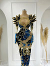 This long blue velvet dress is a stunning choice for any formal occasion or special event. The rich blue color is deep and alluring, while the velvet fabric is soft to the touch and provides a comfortable fit. The long sleeves and floor-length hemline make this dress appropriate for more formal occasions, while the intricate flower lace overlay adds a touch of romance and femininity. The lace is accented with sparkling stones that catch the light beautifully, adding an extra touch of glamour and shine. Whether you're attending a black tie event or simply want to feel extra special, this dress is sure to make a statement and have you turning heads. The combination of the luxurious velvet fabric, the romantic flower lace, and the sparkling stones make this dress a true showstopper.