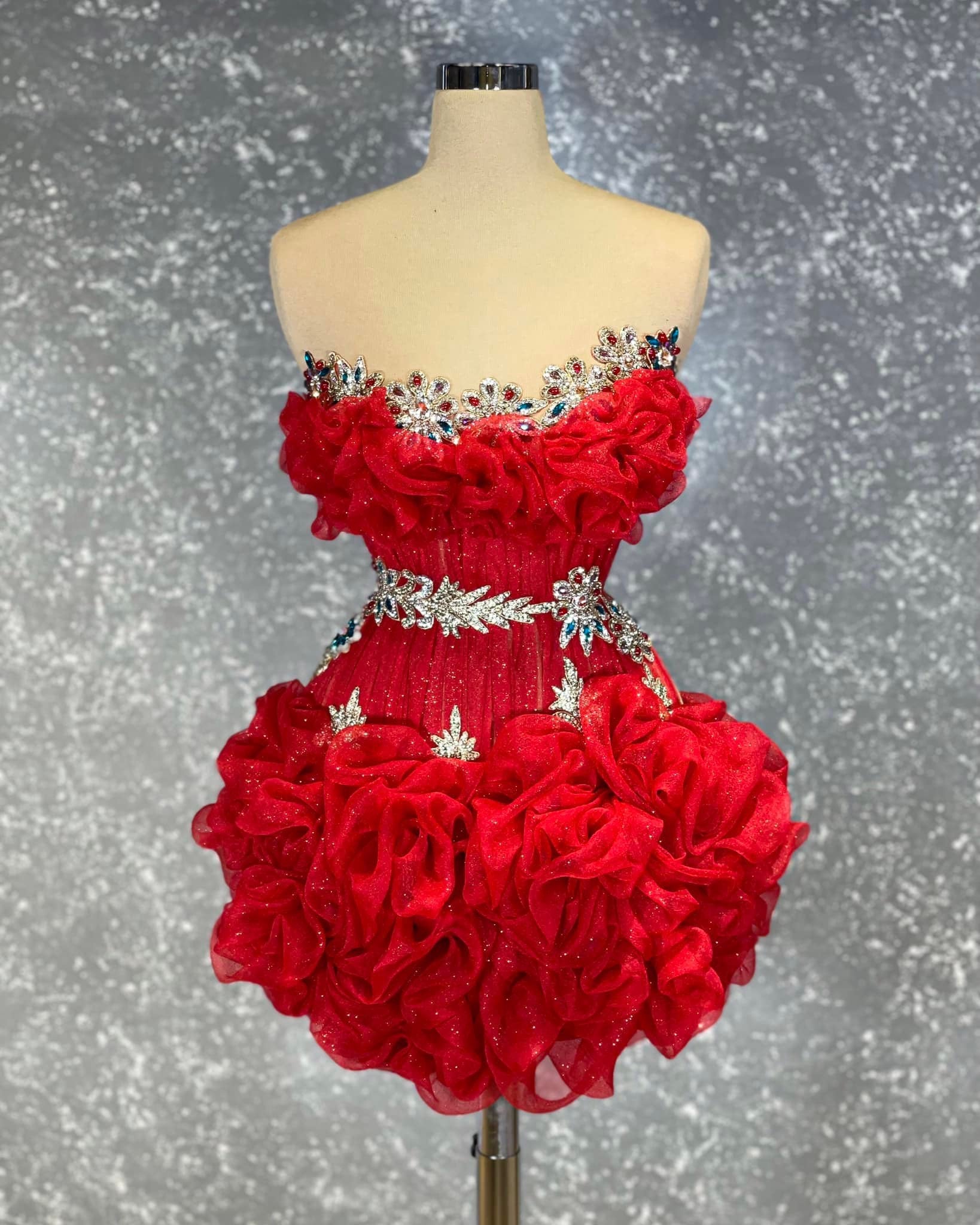 This short, sleeveless dress features a vibrant red color and is adorned with sparkling stones for a touch of glamour. The dress is designed with layered tulle, adding a playful and feminine flair to the overall look. Perfect for a special occasion or a night out on the town