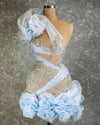 This short dress is a showstopper, featuring a unique one-shoulder design that is both elegant and on-trend. The dress is crafted from a luxurious fabric, and is adorned with sparkling silver stones that catch the light beautifully, adding a touch of luxury and sparkle to the overall look. The dress features layers of delicate blue tulle, adding a touch of romance and elegance. The tulle layers are expertly cut and sewn to create a flowy and ethereal look that is perfect for any special occasion. The one-shoulder design and silver stone embellishments make this dress a true head-turner, perfect for a cocktail party, prom night, gala, or any other formal event.