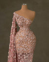 A captivating feature of this Pink Dress is the side cape that gracefully begins at the shoulder, cascading down to the floor. This whimsical extension adds an element of drama and movement, ensuring you make a grand entrance wherever you go. This Pink Dress, adorned with exquisite lace, floral embellishments, and subtle beadwork, is a timeless masterpiece. It promises to make every moment memorable with its side cape.