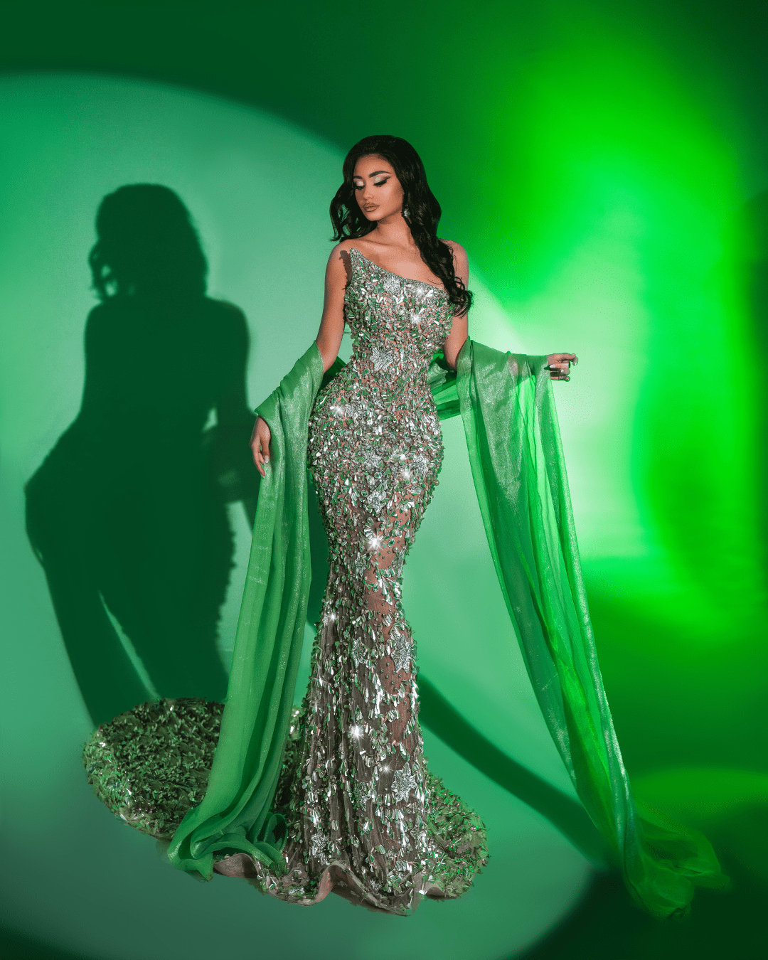 Finished with subtle hints of feathers and radiant highlights that catch the light, this dress embodies luxury and empowerment. It is perfect for red-carpet moments, high-fashion editorials, or any event where making a bold, unforgettable impression is the goal.