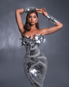 This stunning dress is a true showstopper, embodying futuristic glamour and red-carpet drama. The gown is a strapless, form-fitting design that sculpts the body with remarkable precision, emphasizing the hourglass figure. It is entirely encrusted with reflective mirror-like tiles, reminiscent of a disco ball, giving it a dazzling, light-catching quality that radiates from every angle. The mirrored effect creates a mesmerizing optical illusion as it reflects surrounding light, making the dress shimmer brilliantly with every movement.