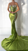 The addition of sparkling crystals elevates the design, adding a radiant touch that catches the light from every angle. These crystals are strategically placed to highlight the fluidity of the floral shapes, creating a dynamic interplay of light and shadow. The combination of the soft green tones with the shimmer of the crystals makes this piece versatile for various occasions, from daytime elegance to evening glamour.