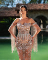 Introducing the Seraffine Dress with Crystal and Fringe Sleeves, a stunning embodiment of elegance and glamour. This exquisite nude gown features intricate floral embroidery, beautifully complemented by sparkling crystals that catch the light with every movement. The dress showcases a sophisticated silhouette that flatters the figure, offering both comfort and style for any special occasion.