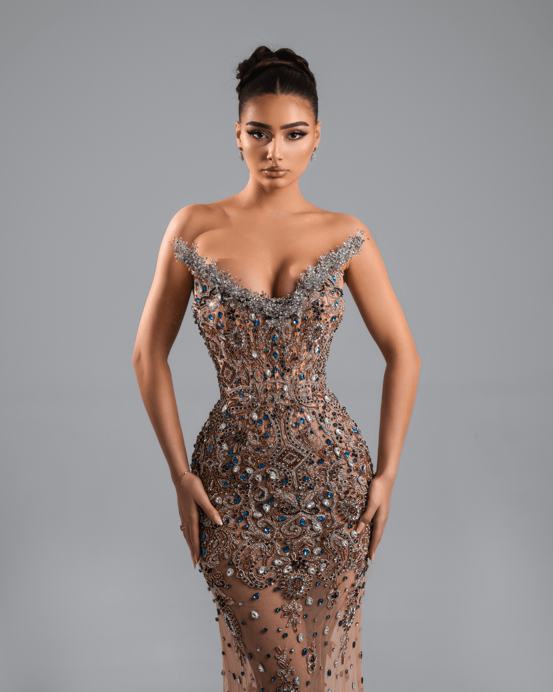This breathtaking gown is a vision of elegance and glamour, blending nude illusion mesh with luxurious embellishments for a truly mesmerizing effect. The dress hugs the body in a flawless mermaid silhouette, accentuating the curves before flaring into a soft, embellished train. Its base is a skin-toned sheer fabric that creates a nearly invisible backdrop, allowing the intricate beadwork and jewels to take center stage.