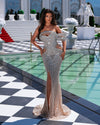 The gown showcases a unique bardot sleeve on one side, elegantly draping over the shoulder and adorned with an abundance of sparkling crystals. This eye-catching detail enhances the dress’s overall opulence, creating a stunning visual effect that catches the light and draws attention.