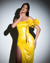 Radiant long yellow dress with shimmering fabric, a sultry leg slit, and an off-shoulder design adorned with floral elegance. Captivate in golden allure. Check Out Mira's Exclusive Collection!