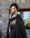 This high neck long black dress is a true showstopper. The deep cuts in the chest and waist add a touch of sexiness to the elegant silhouette, while the side cape adds a dramatic and stylish twist. The dress is made of a luxurious and comfortable fabric that drapes beautifully and flatters the figure. The high neckline elongates the torso and creates a graceful, elongated silhouette, while the cutout details draw the eye and add a touch of glamour. The side cape adds a unique and fashion-forward element to the dress, making it suitable for a variety of occasions. Whether you're attending a formal event or a special occasion, this dress is sure to turn heads.