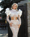 This stunning white dress is adorned with delicate pearls, adding a touch of elegance and glamour to the garment. The deep cut in the waist adds a flirty and alluring touch, while the classic white color keeps the overall look sophisticated. The dress is perfect for formal events and special occasions, and is sure to make a statement wherever it is worn. The pearl detailing and waist cutout make it a unique and stylish choice, sure to turn heads and draw admiring glances.
