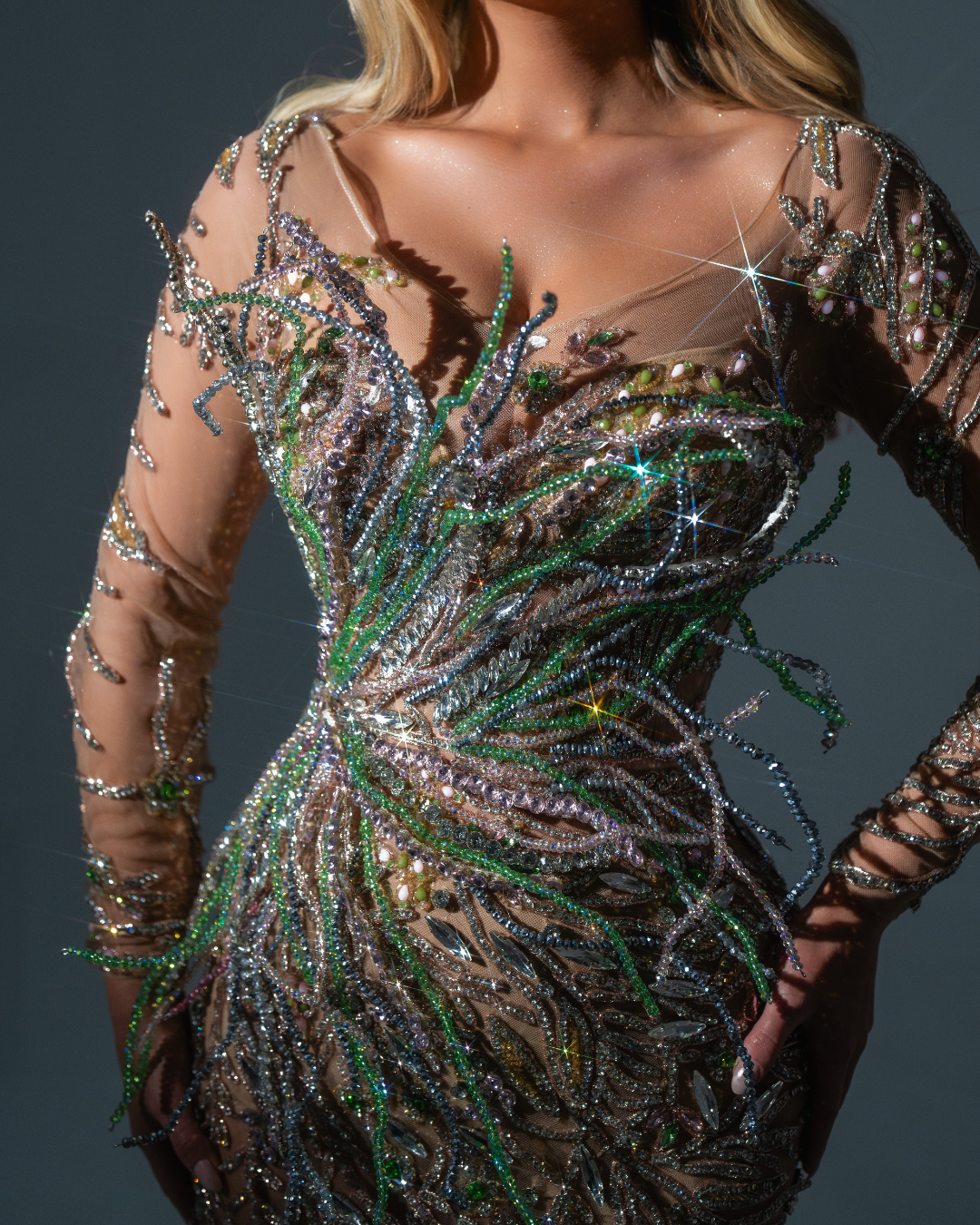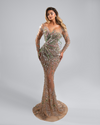 This exquisite gown is the epitome of sophistication and red-carpet glamour, designed to dazzle from every angle. Crafted from a nude-toned sheer base, it creates a flawless illusion that allows the ornate embellishments to take center stage. The bodice features a structured, sculpted design that hugs the body with impeccable precision, creating a cinched waist and an hourglass silhouette. Intricate silver crystal embroidery cascades from the bust in organic, leaf-like patterns, spreading downward across the gown in a graceful, flowing motion.