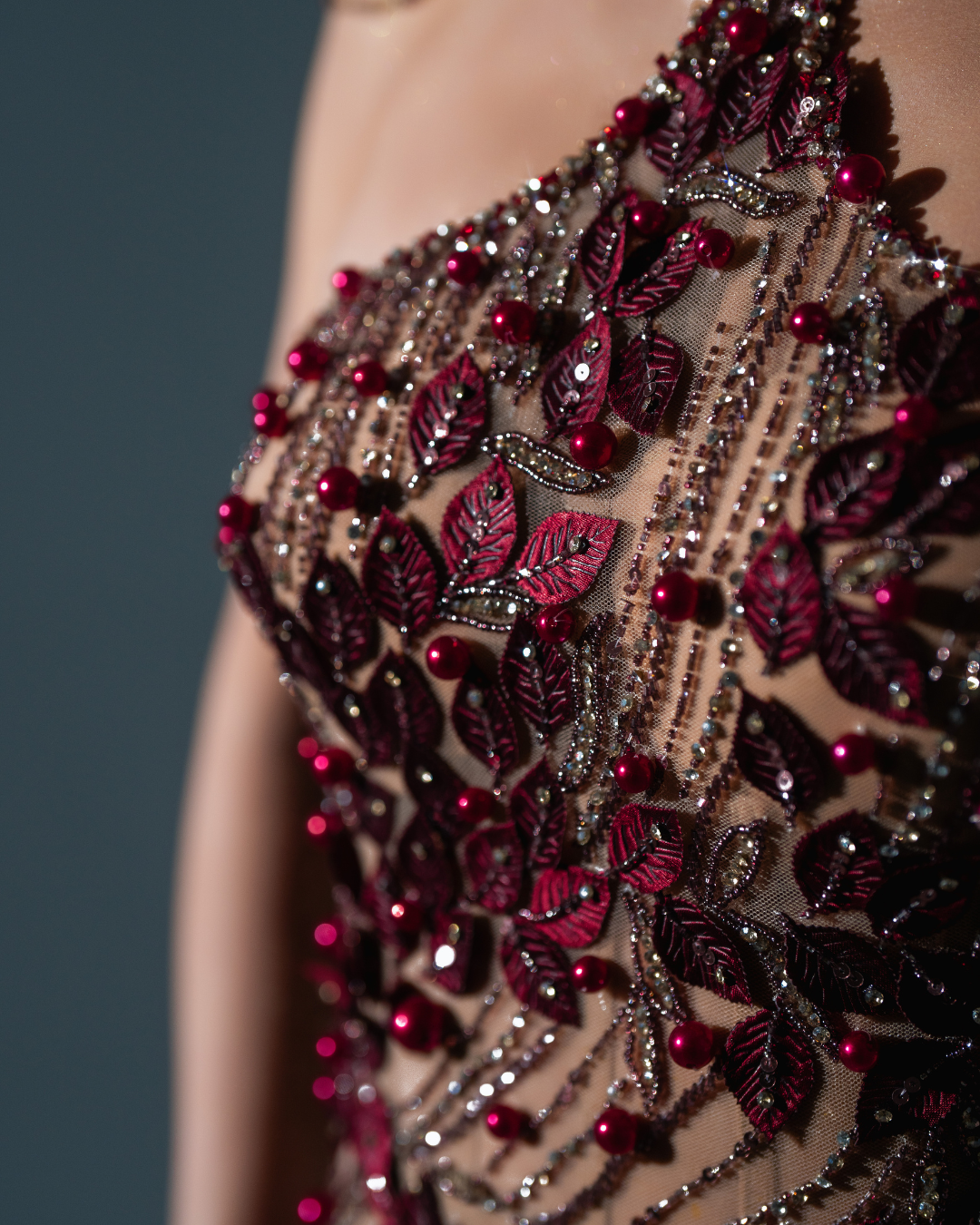 This enchanting red and nude gown is a dramatic fusion of sophistication and luxury. The base is crafted from a sheer nude fabric that clings gracefully to the body, providing a soft, ethereal foundation for the opulent red beadwork that cascades from the bodice to the hem. Intricately placed ruby-hued beads and crystals form ornate vine and leaf motifs, artfully highlighting the curves of the silhouette.