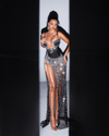 The skirt flows into a cascade of hand-applied rhinestones and sequins, creating a radiant, star-like sparkle with every movement. A high side slit adds dramatic flair, revealing the leg and enhancing the gown’s red carpet allure. The mix of black mesh and silver crystal accents strikes a perfect balance between mystery and glam, making this dress a true showpiece.