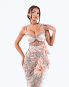 The real showstopper is the fully embellished skirt, adorned with intricate crystal beadwork and sequins, cascading down in ornate patterns. Each step glimmers with elegance, while a sheer base adds a sultry, modern twist. The gown is further elevated by the dramatic use of feather accents—wisps of soft blush feathers artfully placed along the silhouette to create fluidity, movement, and texture.