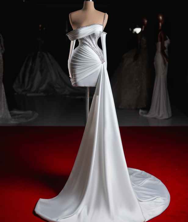 The gown’s one-shoulder design adds a contemporary twist, offering an asymmetrical allure that highlights the collarbone and shoulders beautifully. Delicate yet daring, this silhouette exudes confidence and charm. The structured bodice is adorned with hand-applied silver stones, meticulously arranged to create a celestial shimmer, catching the light with every movement.