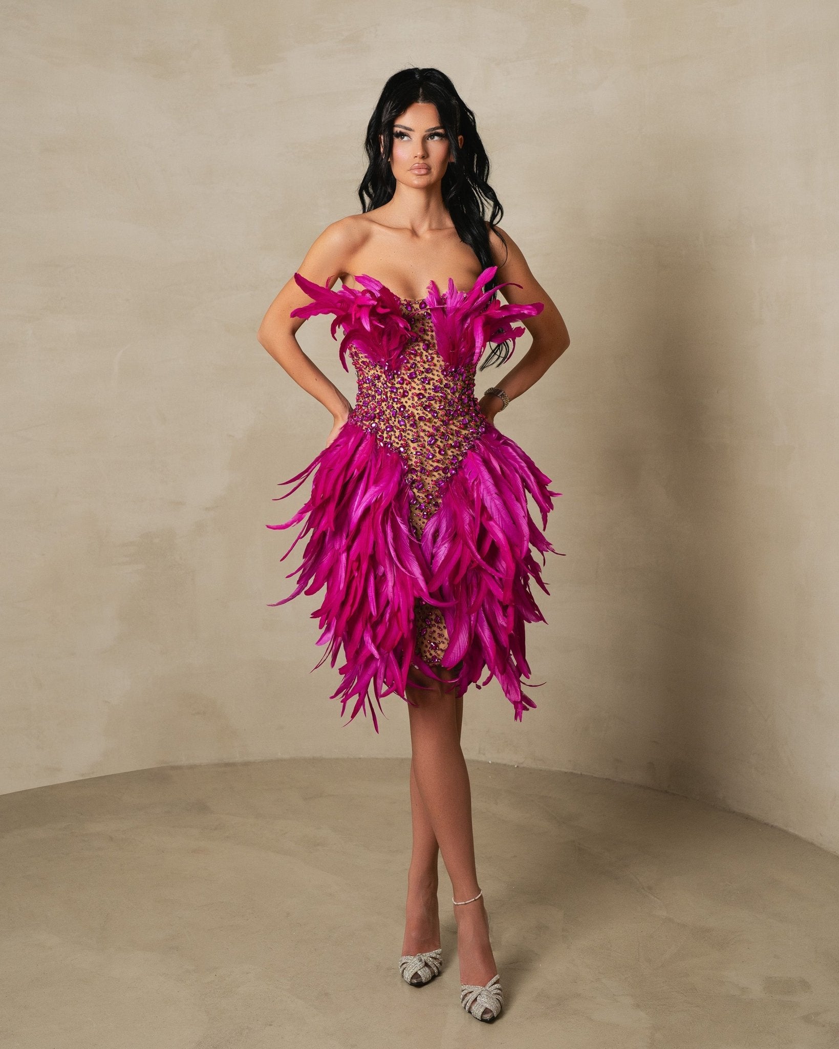 Kleosy Pink Midi Dress With Feathers And Crystals