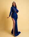 To enhance the allure of the One Shoulder Blue Dress and complement the deep blue hue, we adorn it with delicate stones in matching shades. We strategically place these glistening embellishments, adding a touch of glamour and sparkle as you move, casting a spell on all who behold you.