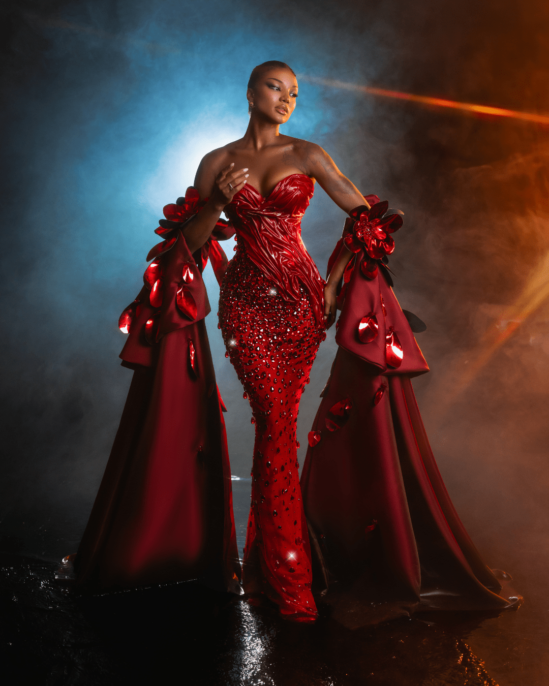 The texture of the gown mimics crushed foil, giving it a futuristic, almost armor-like aesthetic—perfect for a modern-day goddess who commands every room she enters. The structured silhouette hugs the figure before falling into a sleek, straight hemline, making every step feel like a red carpet moment.