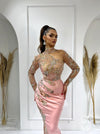 A high neck dress with a deep slit is a sophisticated and alluring garment that is perfect for a formal event or a special occasion. The dress features a high neckline that covers the collarbone and extends up to the base of the neck, creating a sleek and elegant silhouette. The body of the dress is fitted to the waist and hips, before flowing into a long, flowing skirt that falls to the floor. The skirt features a deep slit that reveals a hint of leg, adding a touch of sexiness to the overall look. The high neck and deep slit make this dress a truly unique and eye-catching garment that is sure to turn heads wherever you go. Whether you're attending a wedding, a black-tie event, or a fancy dinner party, this high neck dress with a deep slit is sure to make you feel confident and stylish.