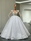 This breathtaking bridal dress is truly one-of-a-kind. The long sleeves and classic silhouette exude sophistication and elegance, while the all-over embellishment of sparkling stones, shimmering sparkles, and delicate pearls adds a touch of glamour and opulence. The intricate design is a work of art, with each pearl and stone placed perfectly to catch the light and create a mesmerizing effect. Whether you're walking down the aisle or posing for photos, this dress is sure to turn heads and make you feel like a true queen on your special day.